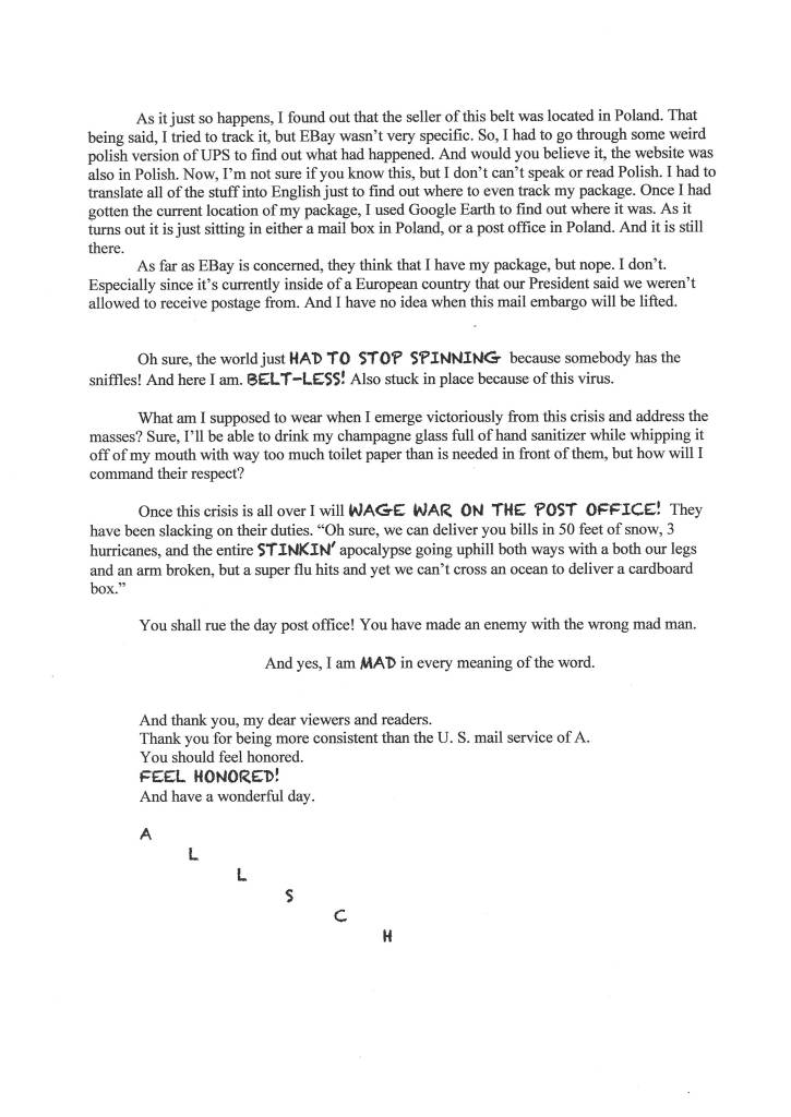 (Note to reader: This is meant to bring joy through insanity. I know that there are more important problems than me not getting a single package. This is all for fun. Also, this looks much better as a word document.)
